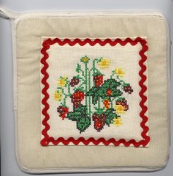 Zunächst das Klebevlies einspannen und dann den Zählstoff aufkleben, so daß er nicht mehr verrutschen kann. Um ganz sicher zu gehen, kann man das Klebevlies noch zusätzlich mit Sprühkleber einsprühen. Nun das Motiv mittig absticken. Um die Exakte Größe von 10 x 10 cm zu erreichen, werden die Längs- und Querfäden herausgezogen und nun sieht man ganz genau, wie weit man den Stoff umbügeln muß. Anschließend wird der Stoff mittig auf dem Topflappen positioniert und mit Sprühkleber fixiert. Nun wird die Zackenlitze jeweils an der Kante herumgelegt und ebenfalls mit Sprühkleber fixiert. Jetzt kann die Litze aufgenäht werden und die Kanten sind dadurch versäubert.